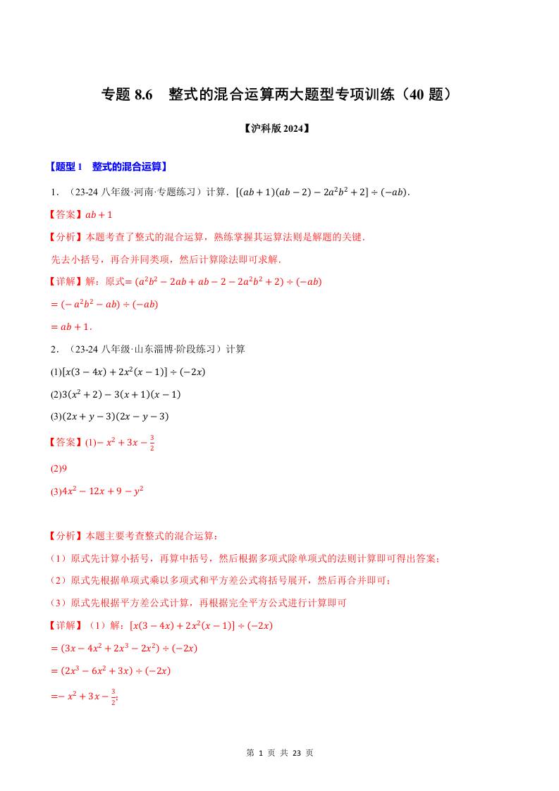 专题8.6 整式的混合运算两大题型专项训练(40题)(解析版)