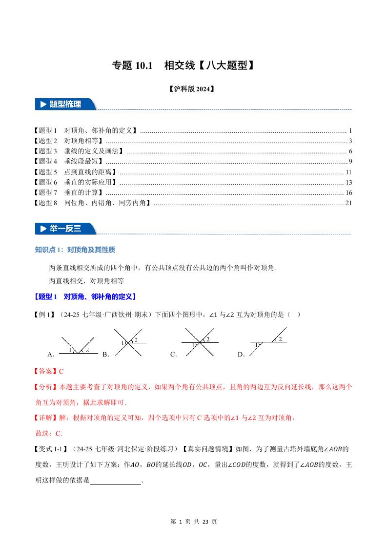 专题10.1 相交线【八大题型】(举一反三)(沪科版2024)(解析版)