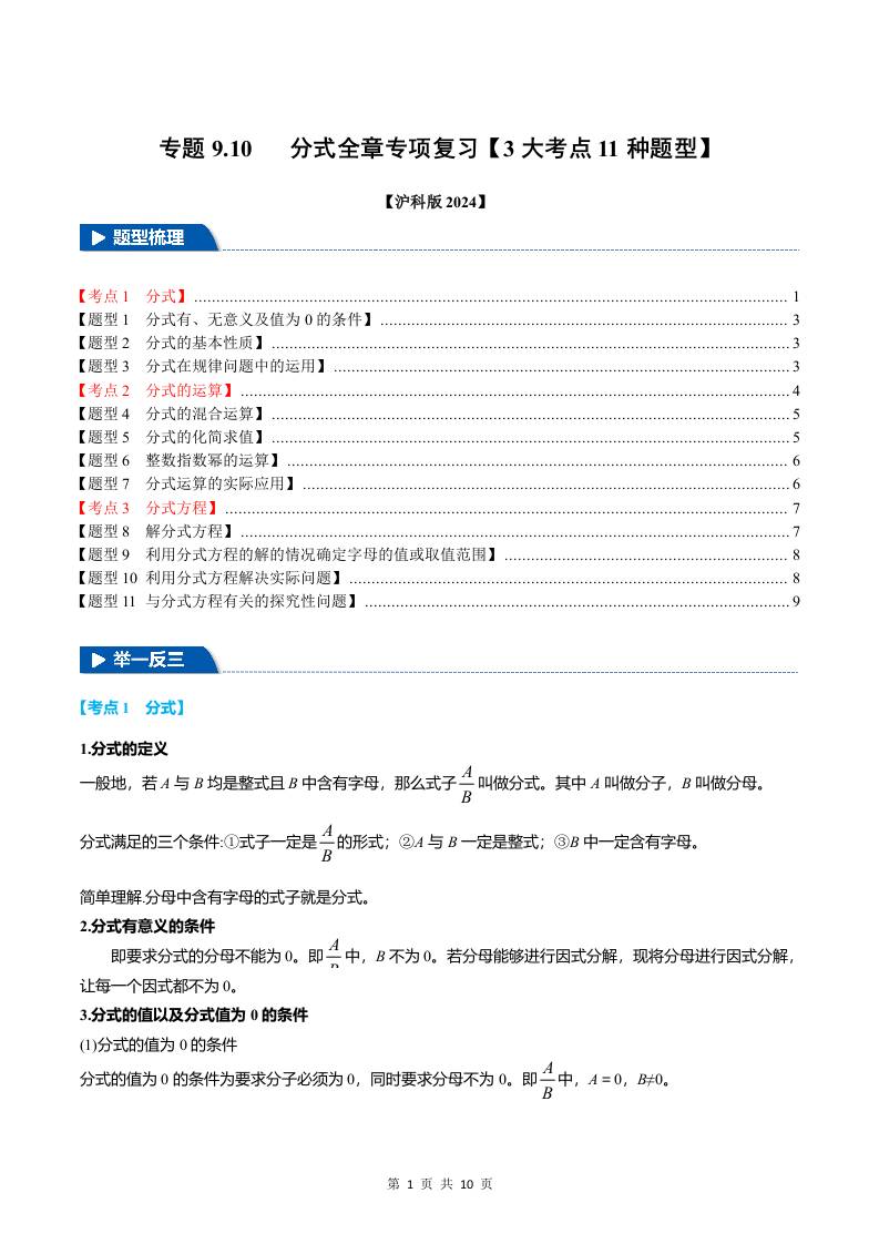 专题9.10 分式全章专项复习【3大考点11种题型】(举一反三)(沪科版2024)(解析版)