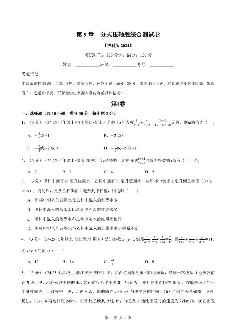 专题9.11 分式压轴题综合测试卷(沪科版2024)(原卷版)