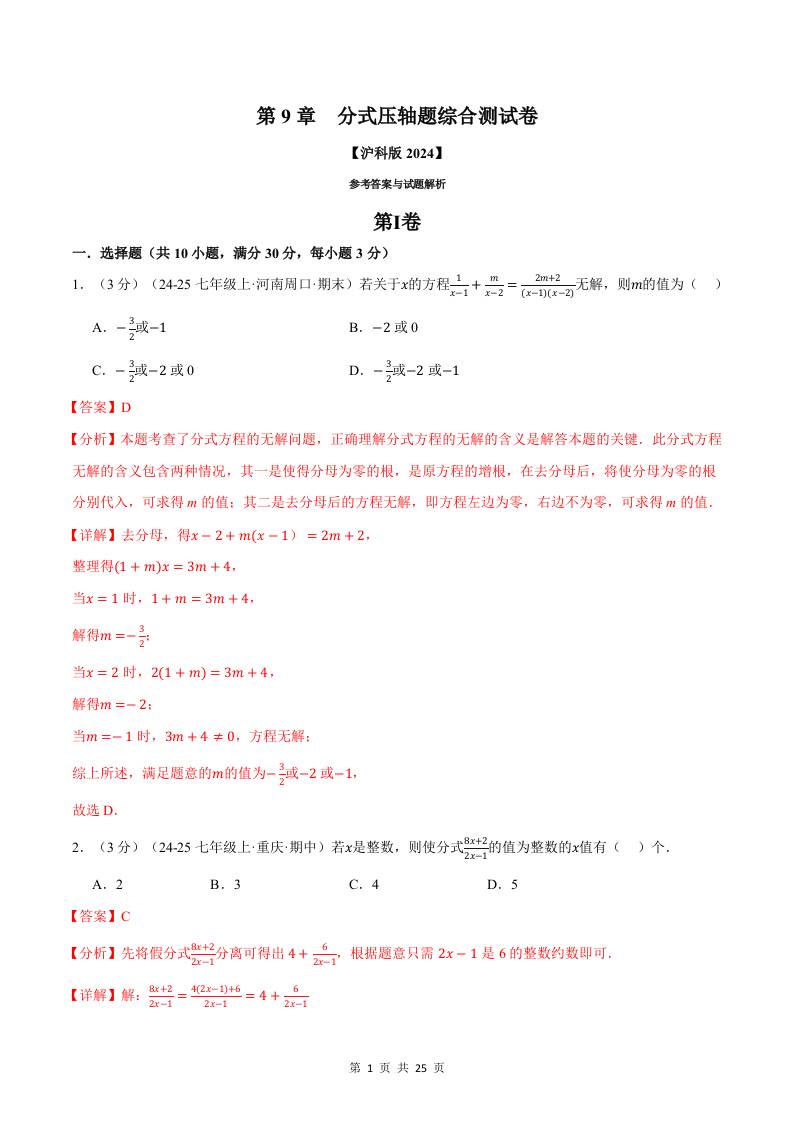 专题9.11 分式压轴题综合测试卷(沪科版2024)(解析版)