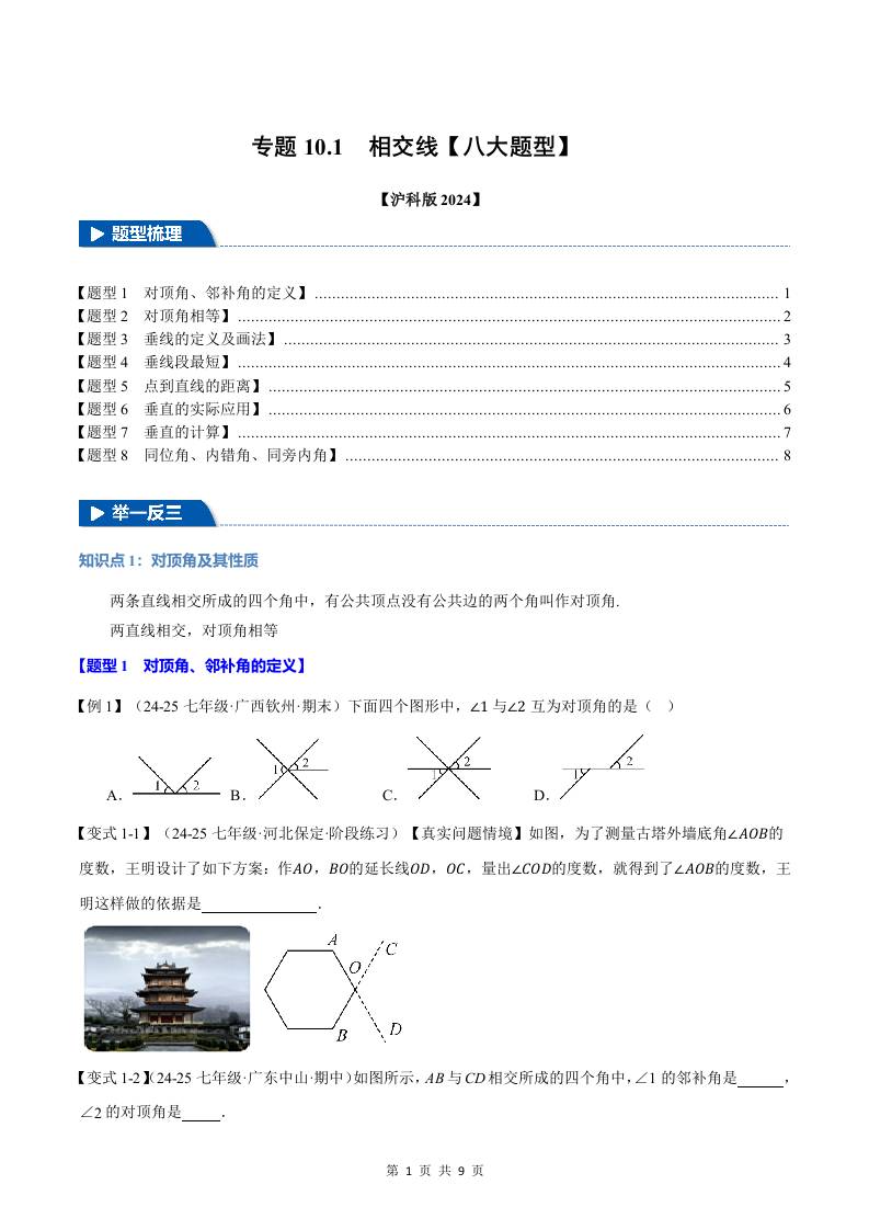专题10.1 相交线【八大题型】(举一反三)(沪科版2024)(原卷版)