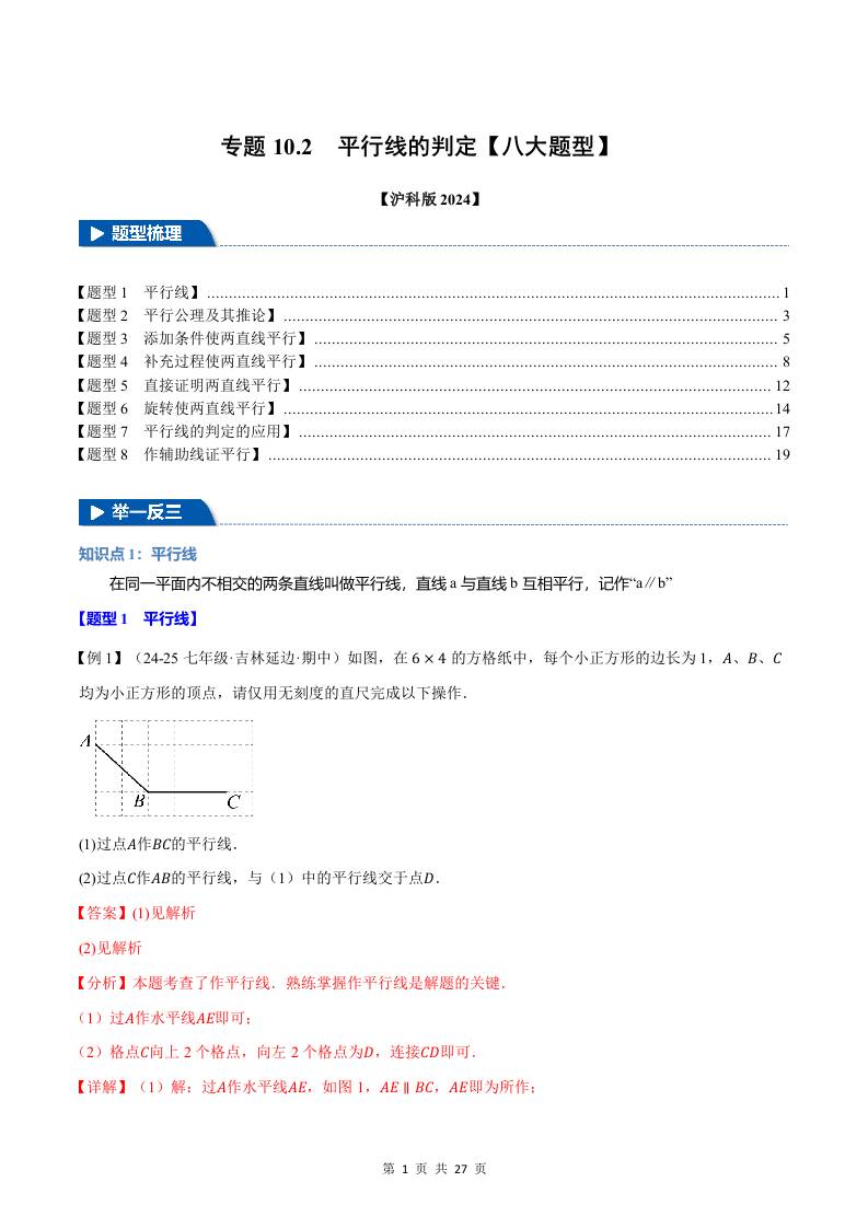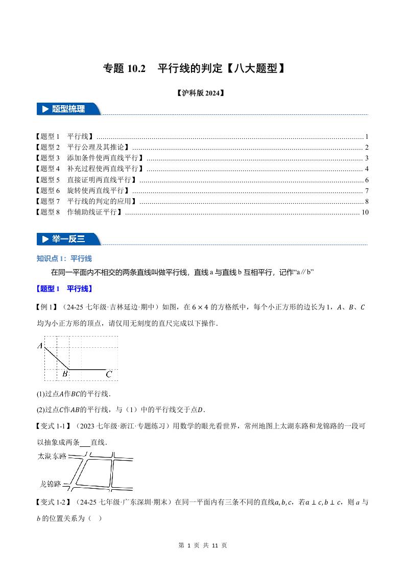 专题10.2 平行线的判定【八大题型】(举一反三)(沪科版2024)(原卷版)