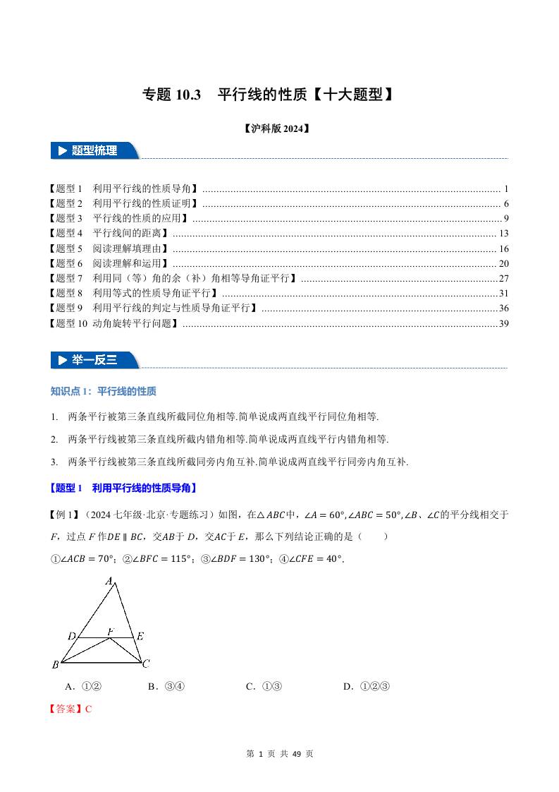 专题10.3 平行线的性质【十大题型】(举一反三)(沪科版2024)(解析版)