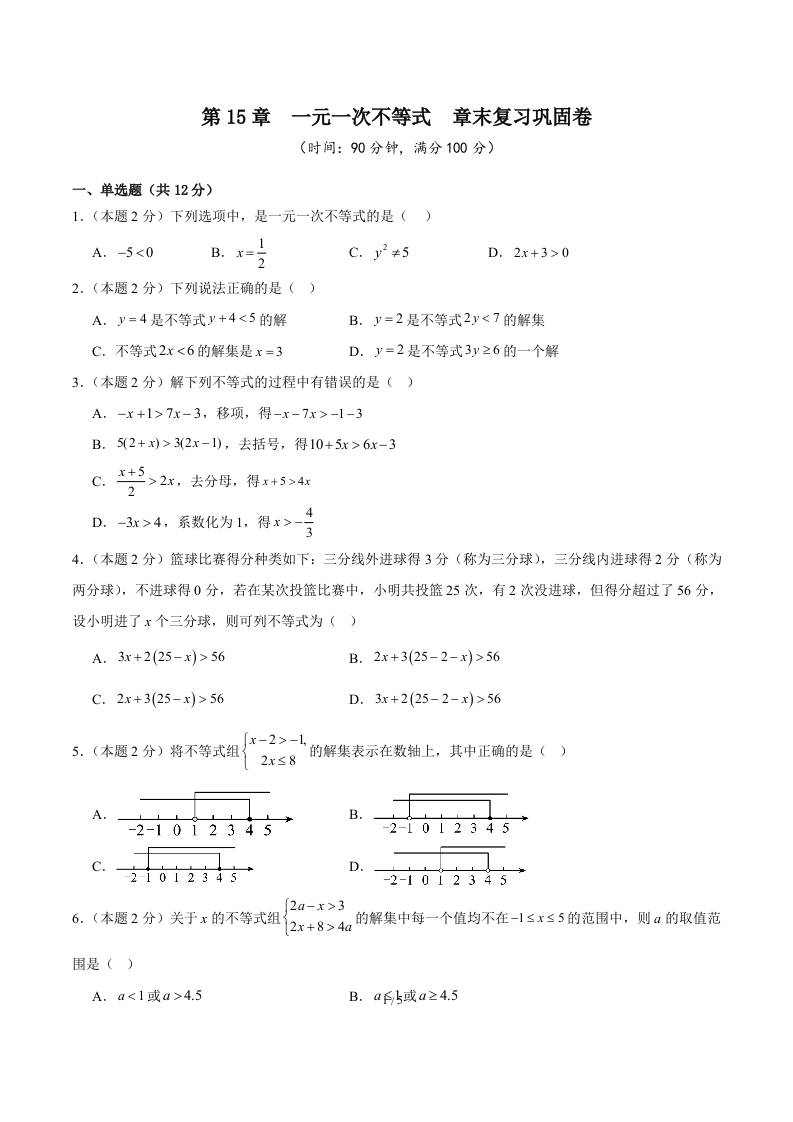 第15章 一元一次不等式 章末复习巩固卷(原卷版)