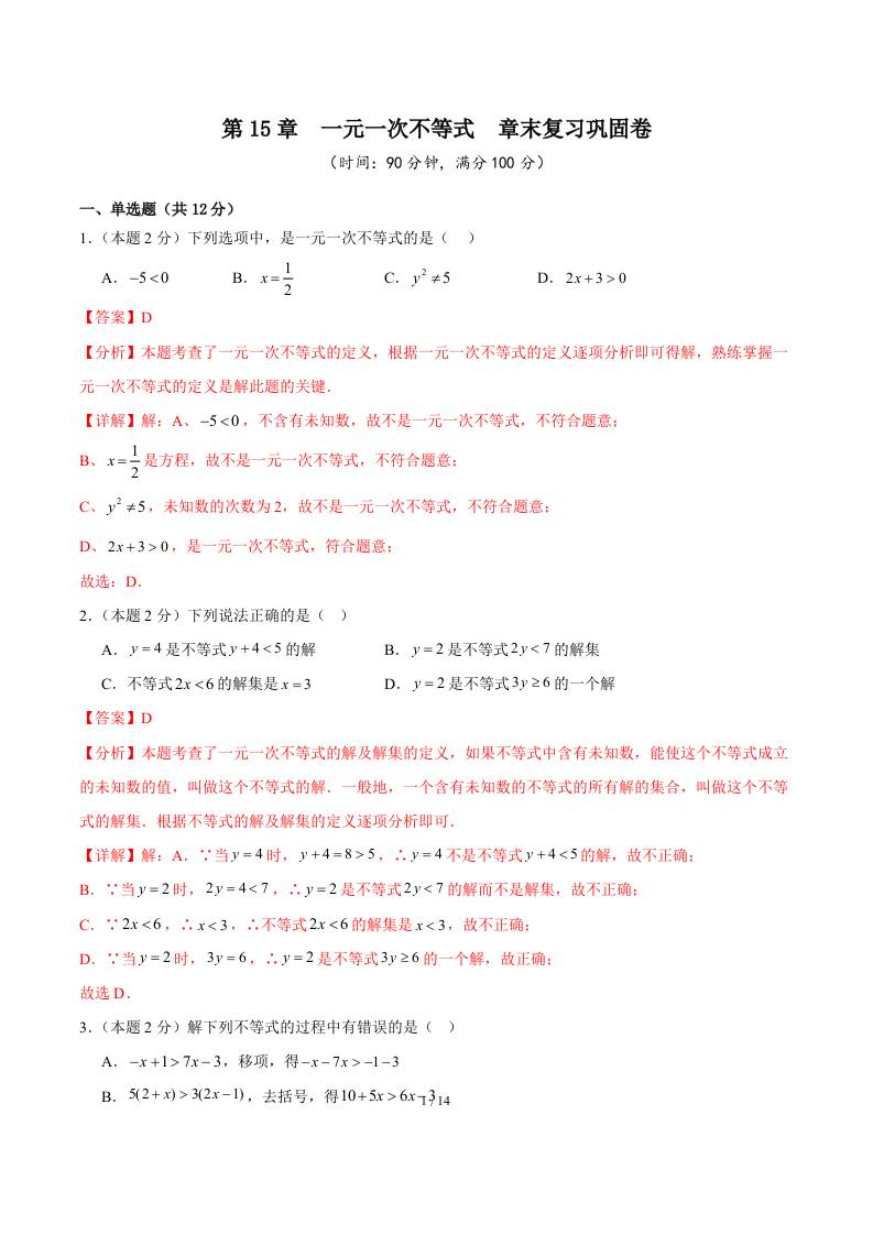 第15章 一元一次不等式 章末复习巩固卷(解析版)