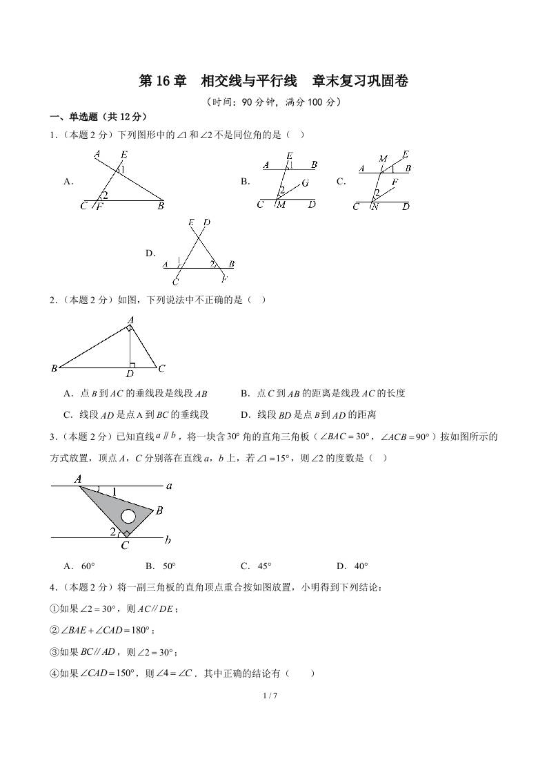 第16章 相交线与平行线 章末复习巩固卷(原卷版)