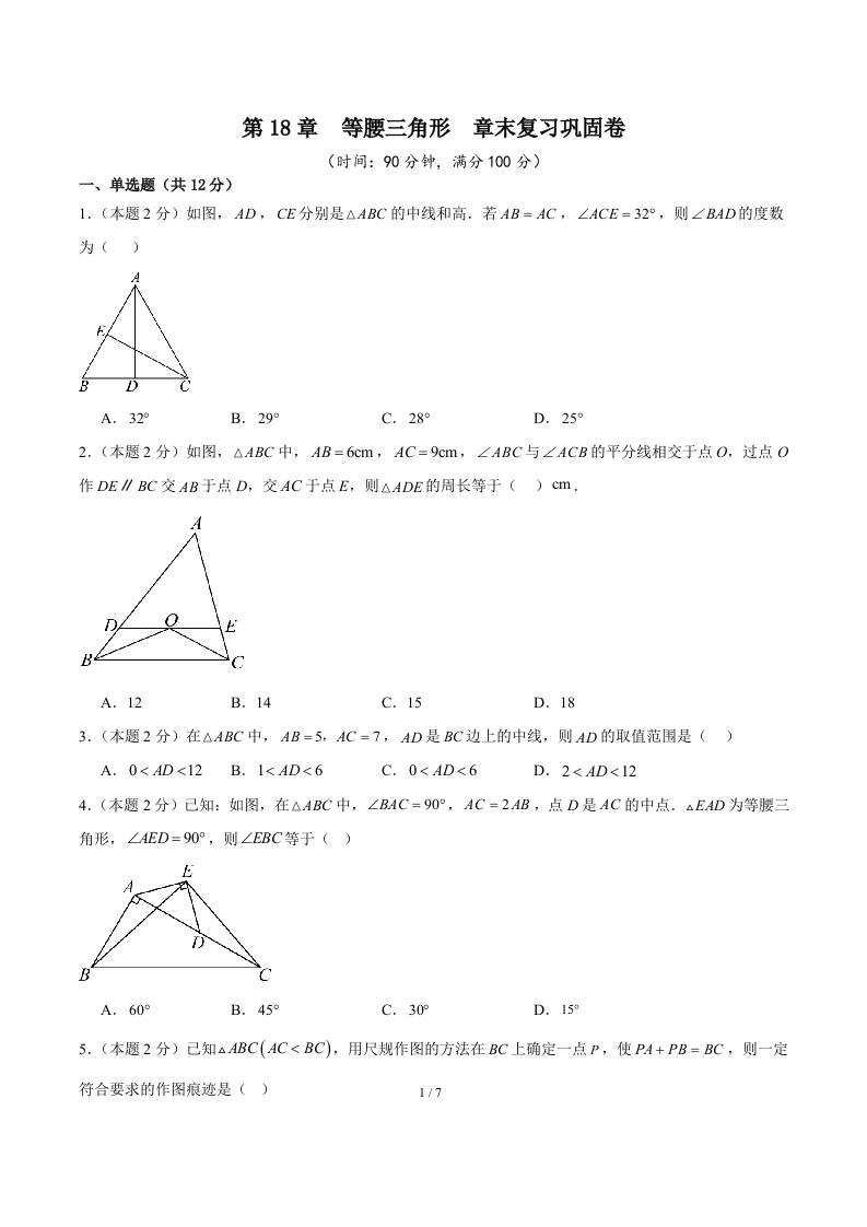 第18章 等腰三角形 章末复习巩固卷(原卷版)