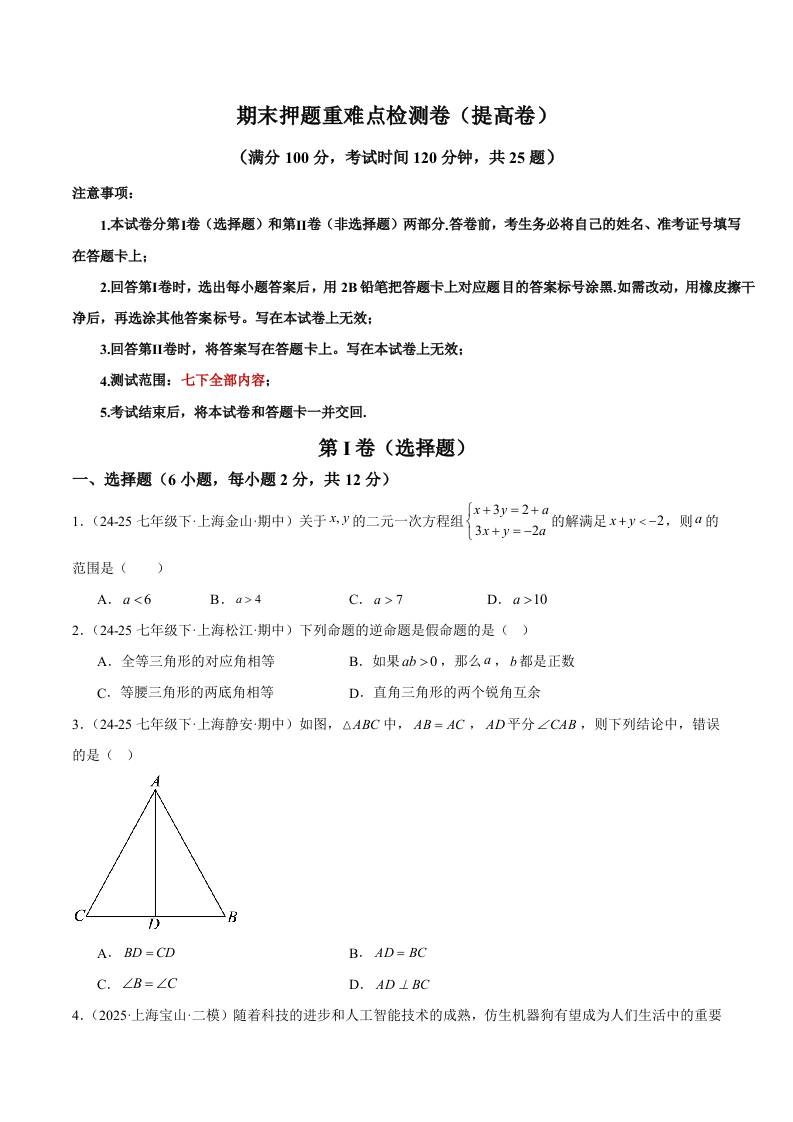 期末押题重难点检测卷(提高卷)(考试范围:沪教版七下全部内容)-2024-2025学年七年级数学下册重难点专题提升精讲精练(沪教版2024)(原卷版)