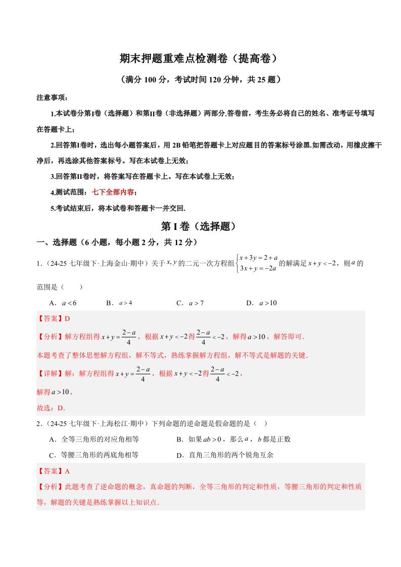 期末押题重难点检测卷(提高卷)(考试范围:沪教版七下全部内容)-2024-2025学年七年级数学下册重难点专题提升精讲精练(沪教版2024)(解析版)