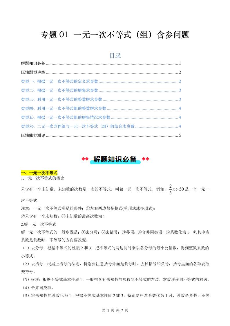 专题01 一元一次不等式(组)含参问题(六大类型)(原卷版)