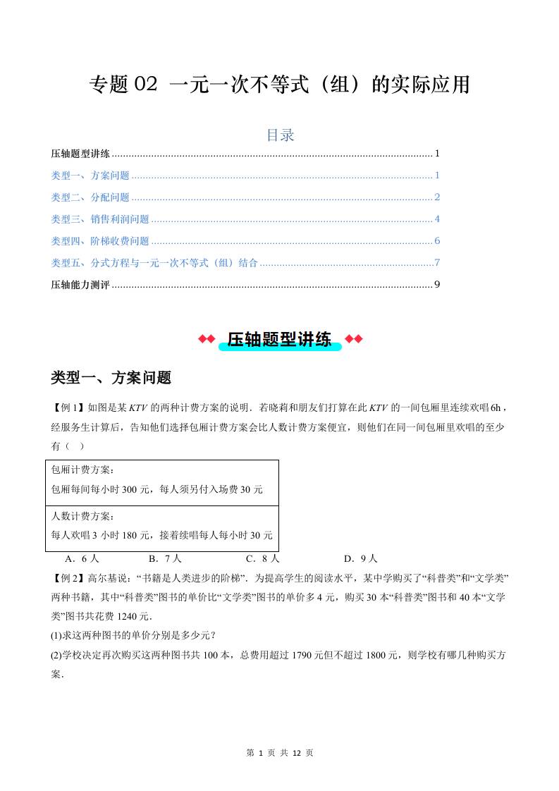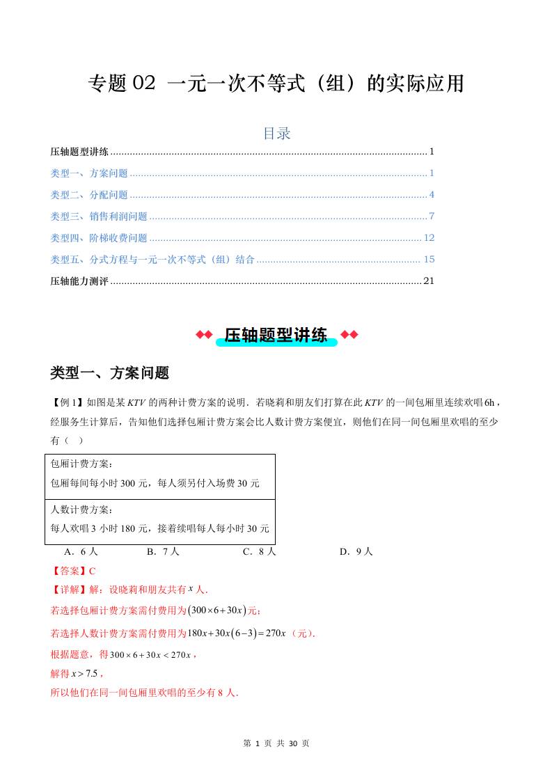 专题02 一元一次不等式(组)的实际应用(五大类型)(解析版)