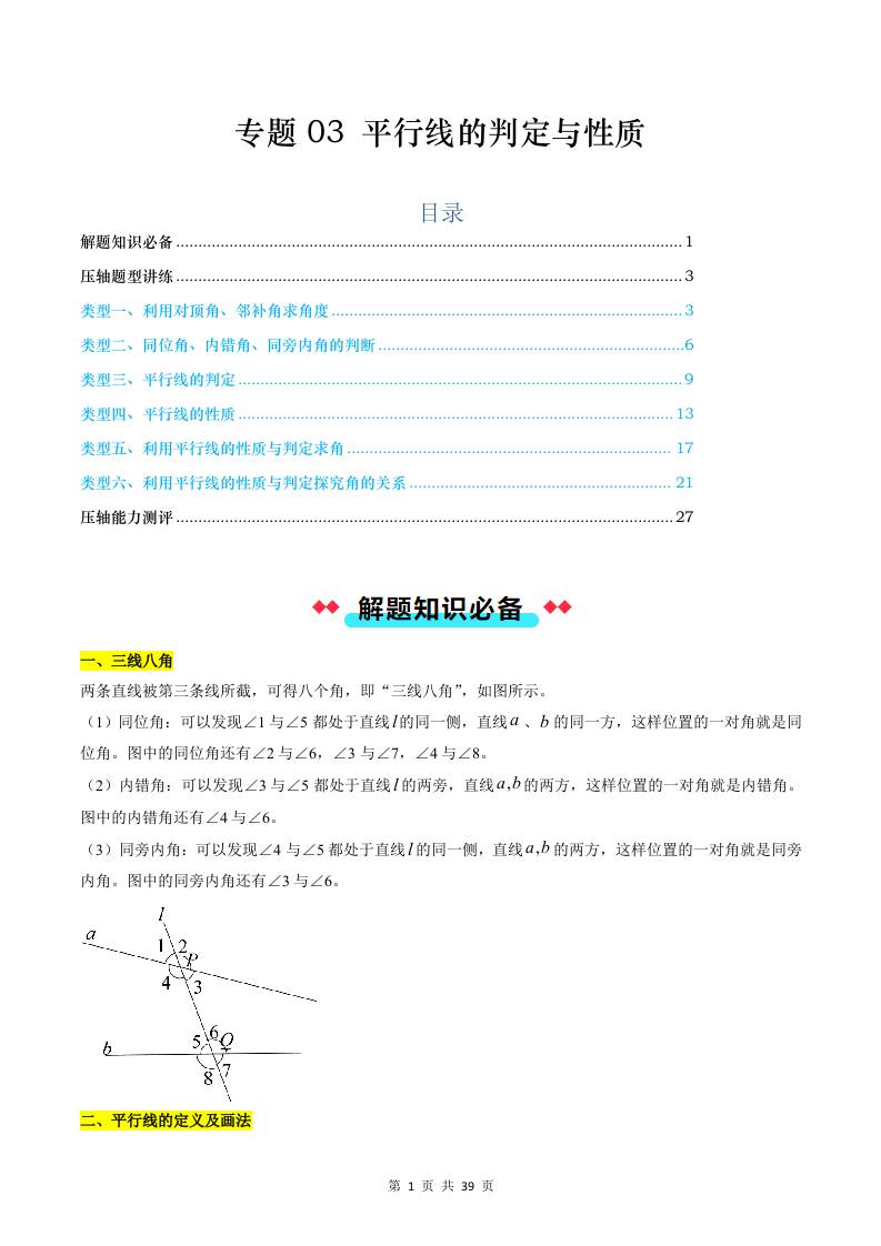 专题03 平行线的判定与性质(六大类型)(原卷版)