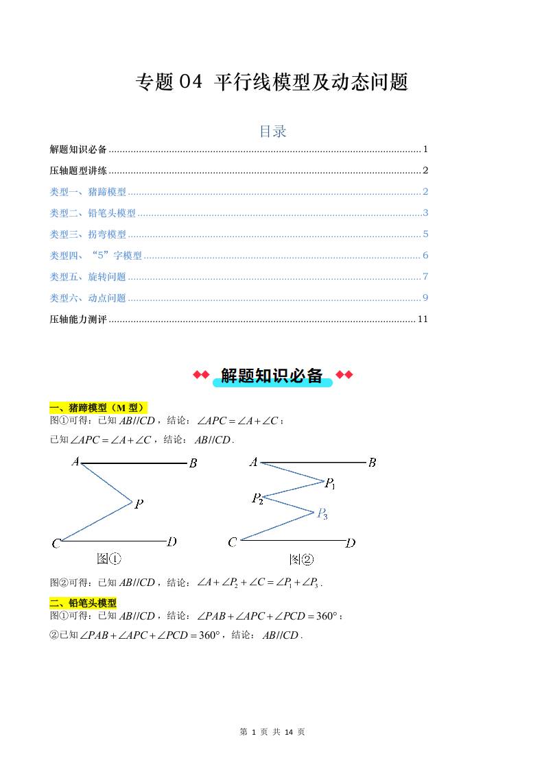 专题04 平行线模型及动态问题(六大类型)(原卷版)