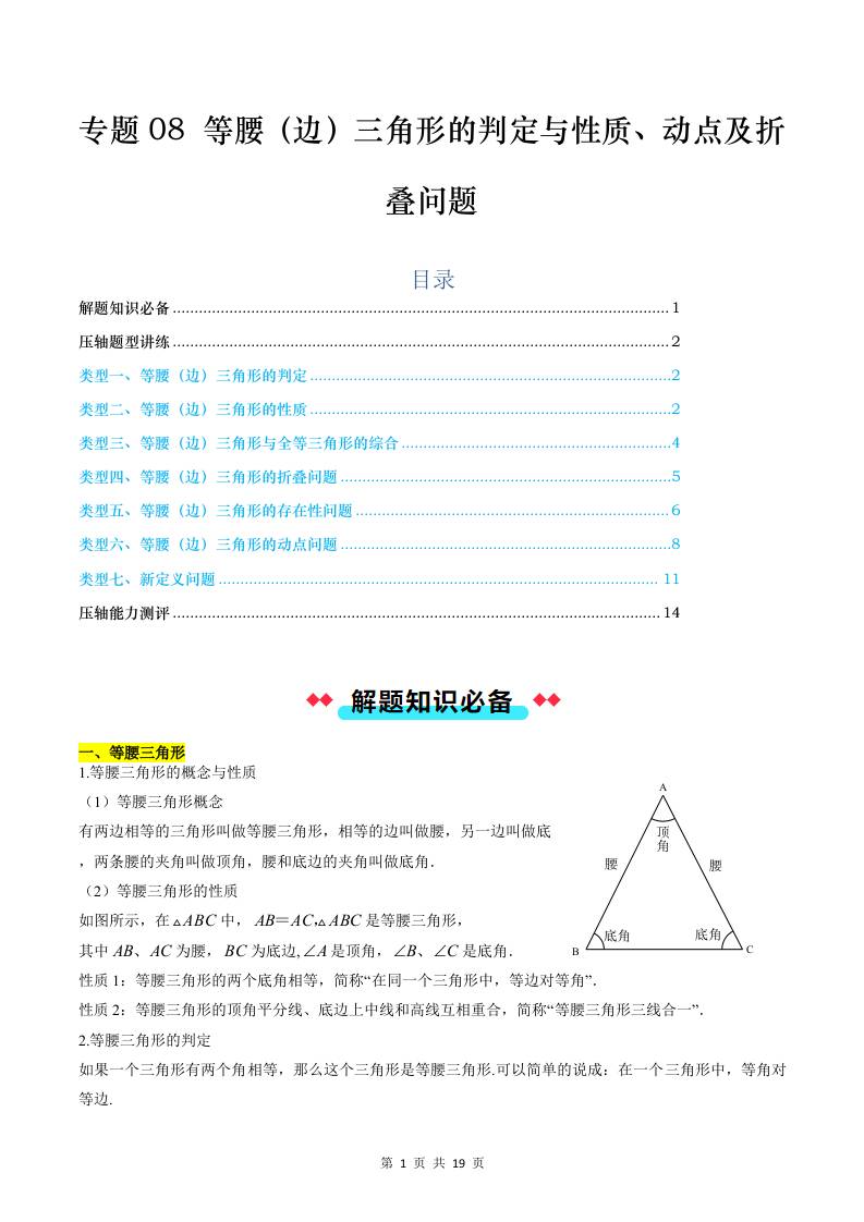 专题08 等腰(边)三角形的判定与性质、动点及折叠问题(七大类型)(原卷版)