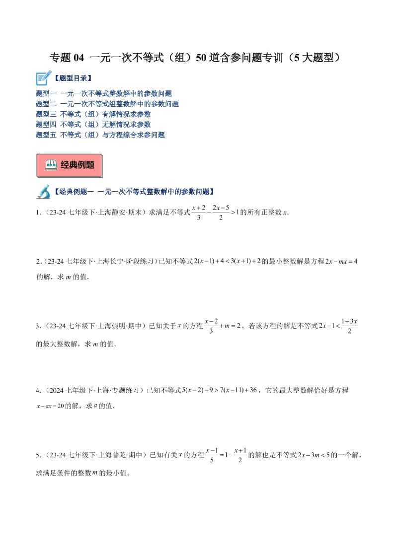 专题04 一元一次不等式(组)50道含参问题专训(5大题型)-2024-2025学年七年级数学下册重难点专题提升精讲精练(沪教版2024)(原卷版)