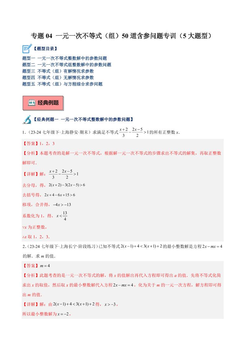 专题04 一元一次不等式(组)50道含参问题专训(5大题型)-2024-2025学年七年级数学下册重难点专题提升精讲精练(沪教版2024)(解析版)