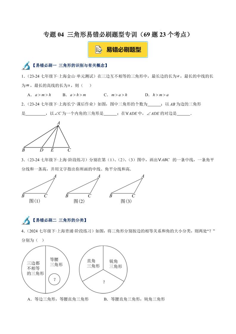专题04 三角形易错必刷题型专训(69题23个考点)-2024-2025学年七年级数学下册重难点专题提升精讲精练(沪教版2024)(原卷版)