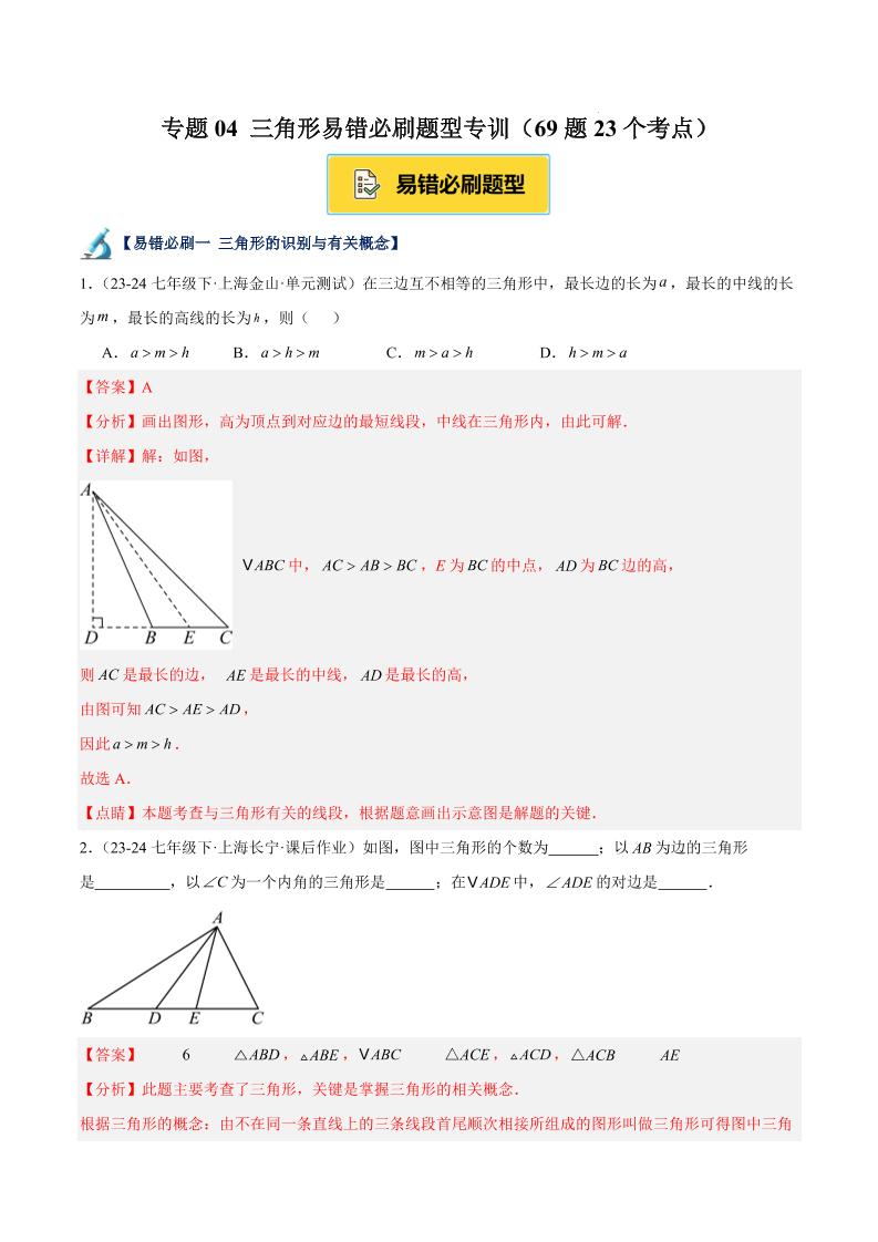 专题04 三角形易错必刷题型专训(69题23个考点)-2024-2025学年七年级数学下册重难点专题提升精讲精练(沪教版2024)(解析版)