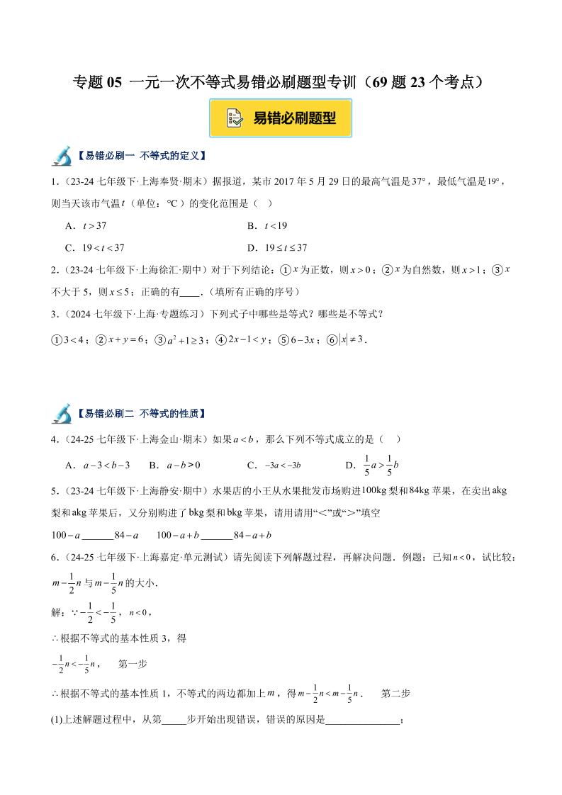 专题05 一元一次不等式易错必刷题型专训(69题23个考点)-2024-2025学年七年级数学下册重难点专题提升精讲精练(沪教版2024)(原卷版)