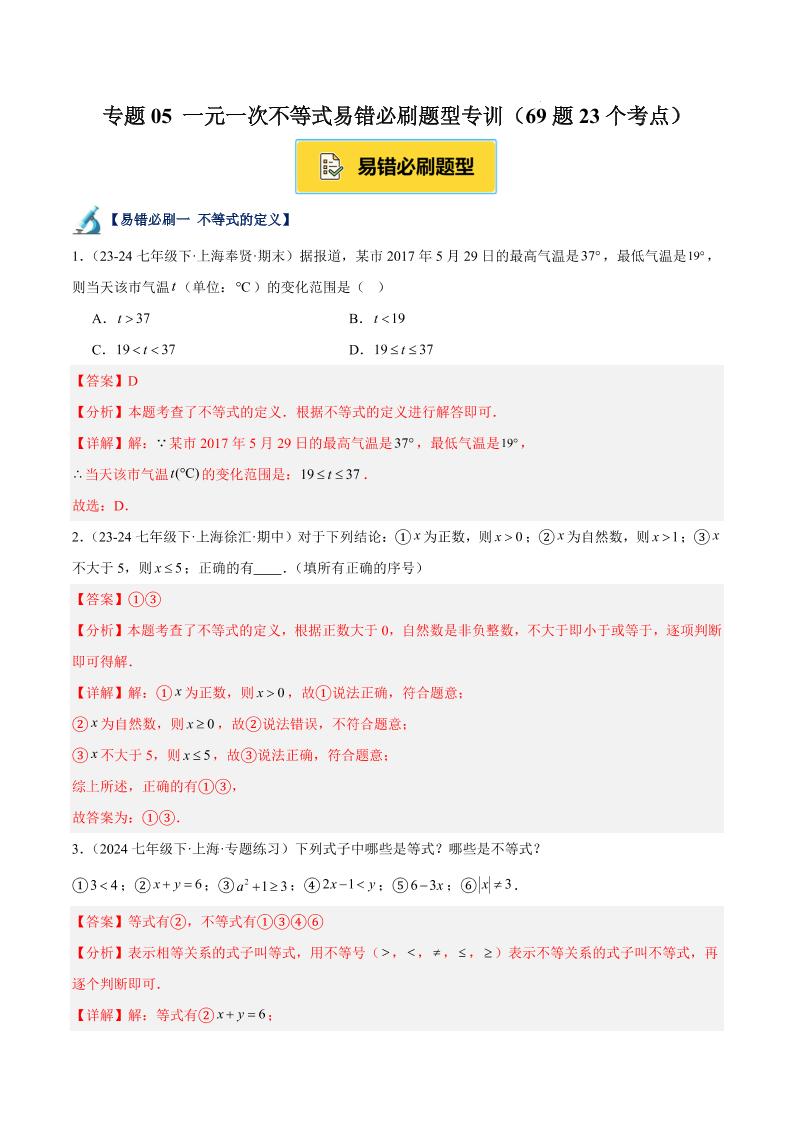专题05 一元一次不等式易错必刷题型专训(69题23个考点)-2024-2025学年七年级数学下册重难点专题提升精讲精练(沪教版2024)(解析版)