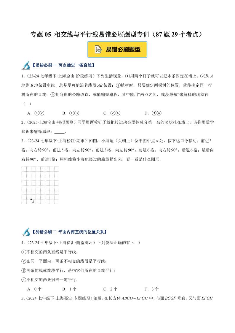专题05 相交线与平行线易错必刷题型专训(87题29个考点)-2024-2025学年七年级数学下册重难点专题提升精讲精练(沪教版2024)(原卷版)