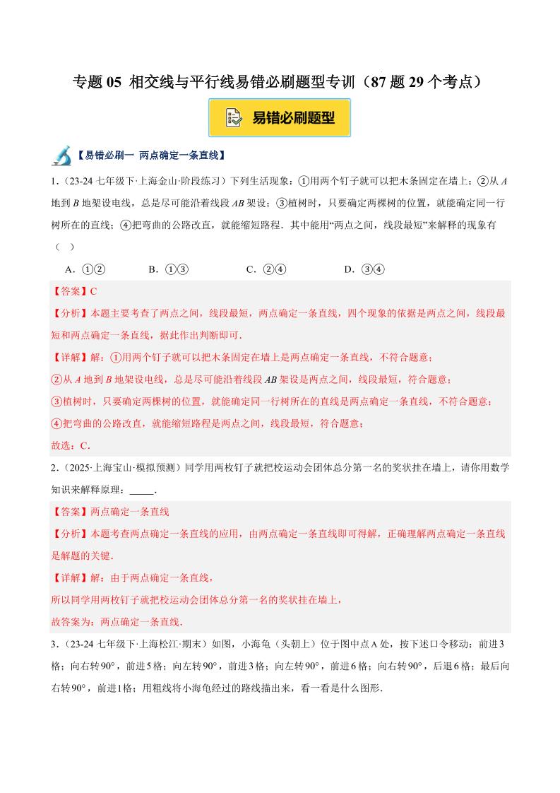 专题05 相交线与平行线易错必刷题型专训(87题29个考点)-2024-2025学年七年级数学下册重难点专题提升精讲精练(沪教版2024)(解析版)