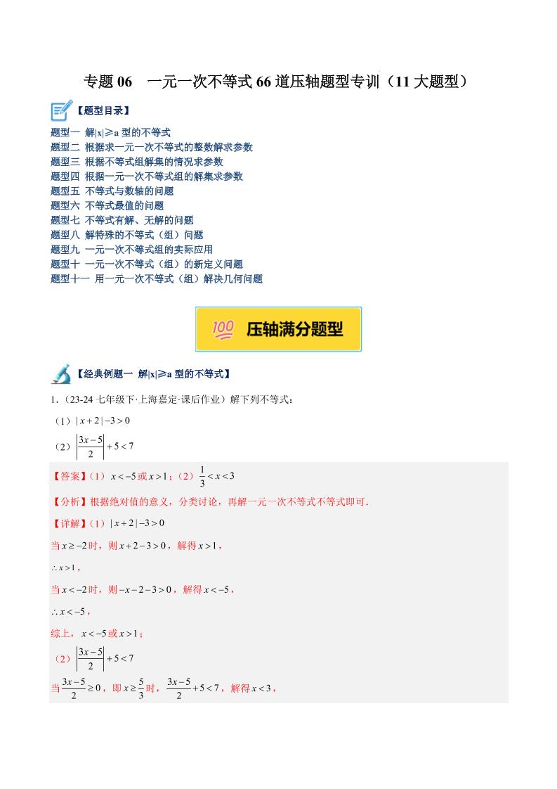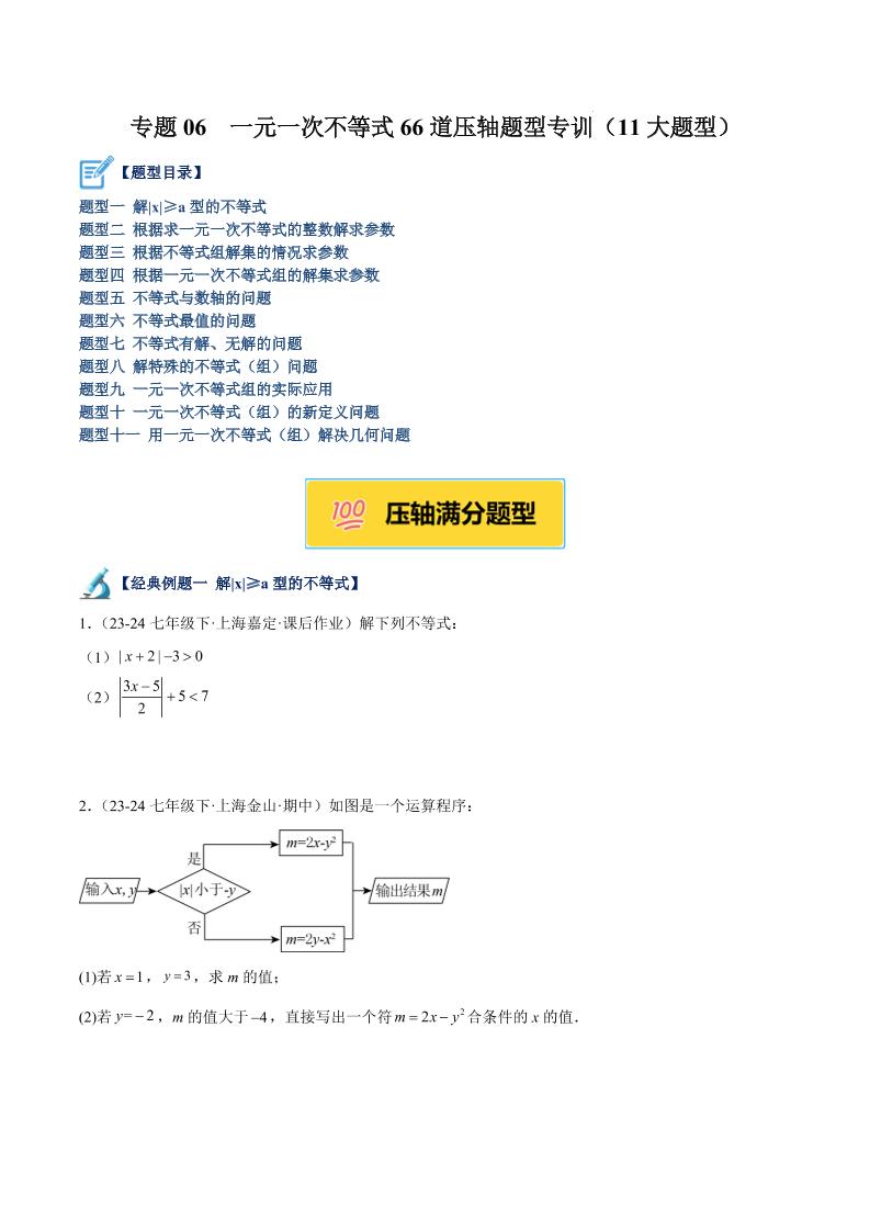 专题06 一元一次不等式66道压轴题型专训(11大题型)-2024-2025学年七年级数学下册重难点专题提升精讲精练(沪教版2024)(原卷版)