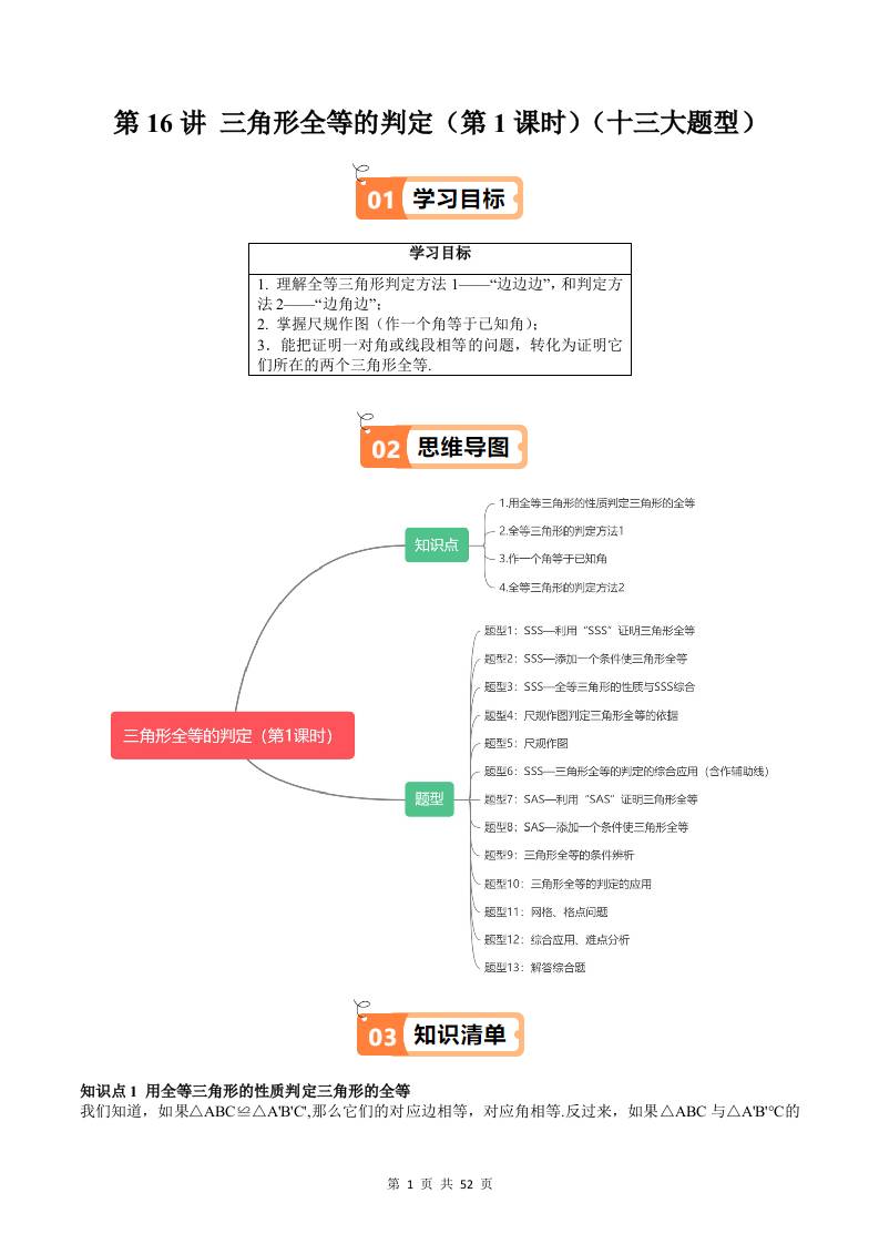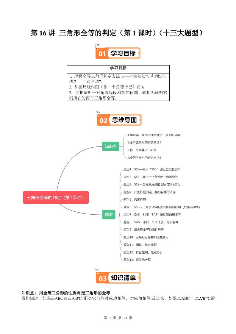 第16讲 三角形全等的判定(第1课时)(十三大题型)(原卷版)