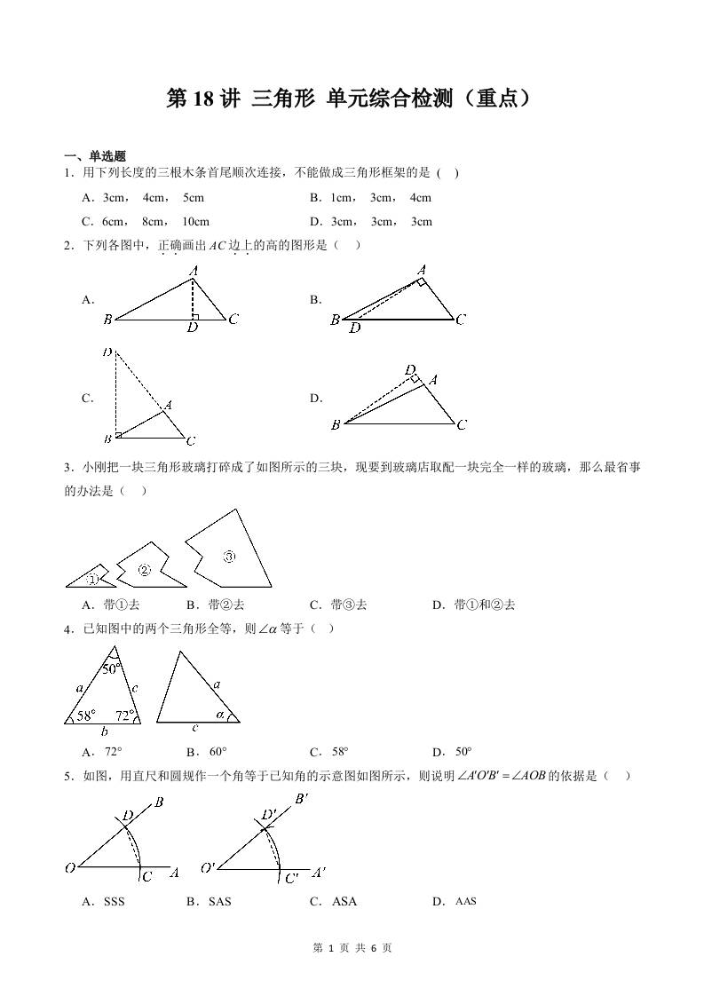 第18讲 三角形 单元综合检测(重点)(原卷版)