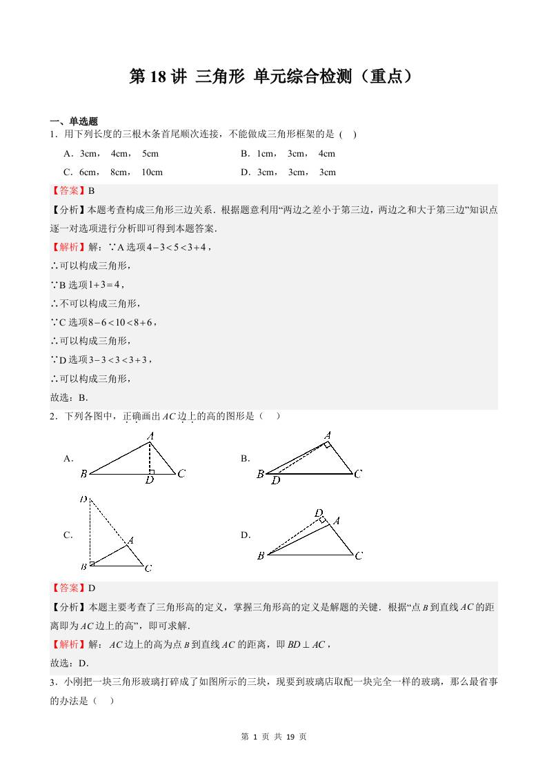 第18讲 三角形 单元综合检测(重点)(解析版)