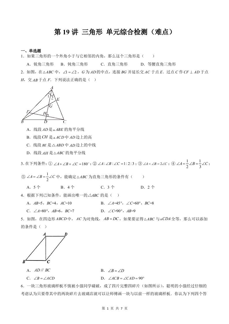 第19讲 三角形 单元综合检测(难点)(原卷版)
