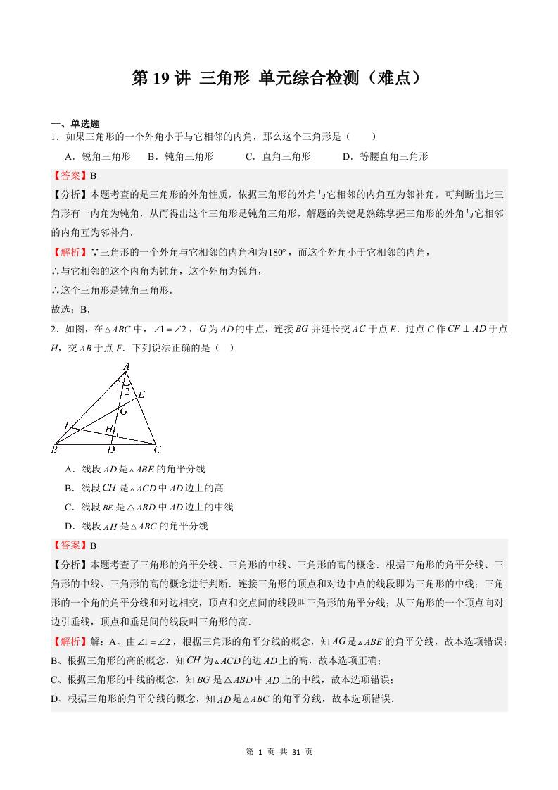 第19讲 三角形 单元综合检测(难点)(解析版)