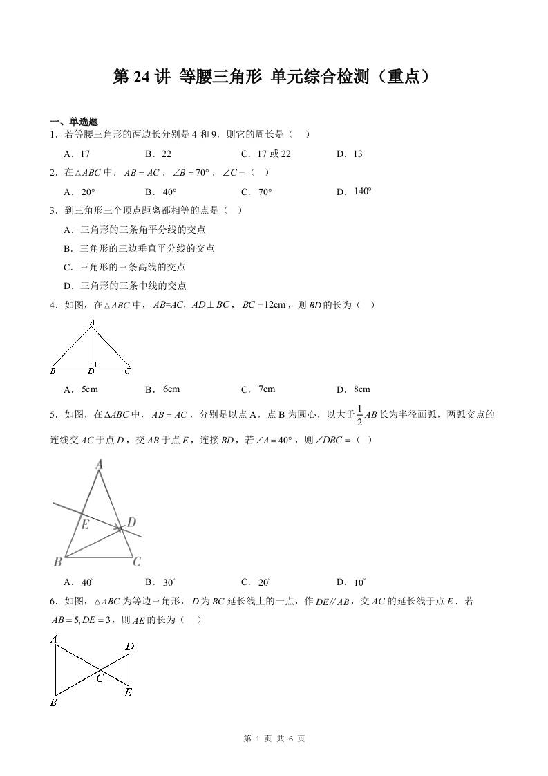 第24讲 等腰三角形 单元综合检测(重点)(原卷版)