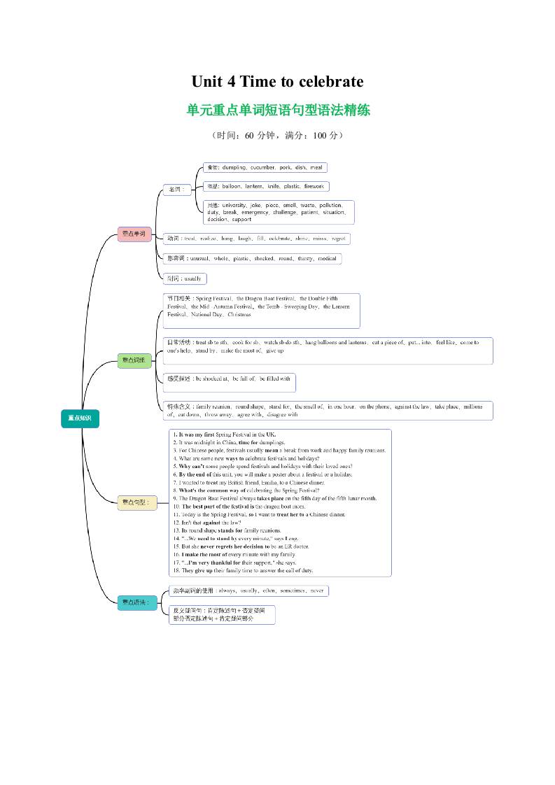 Unit 4 Time to celebrate 单词短语句型语法(教材考点精练)(原卷版)