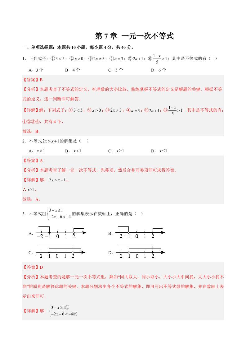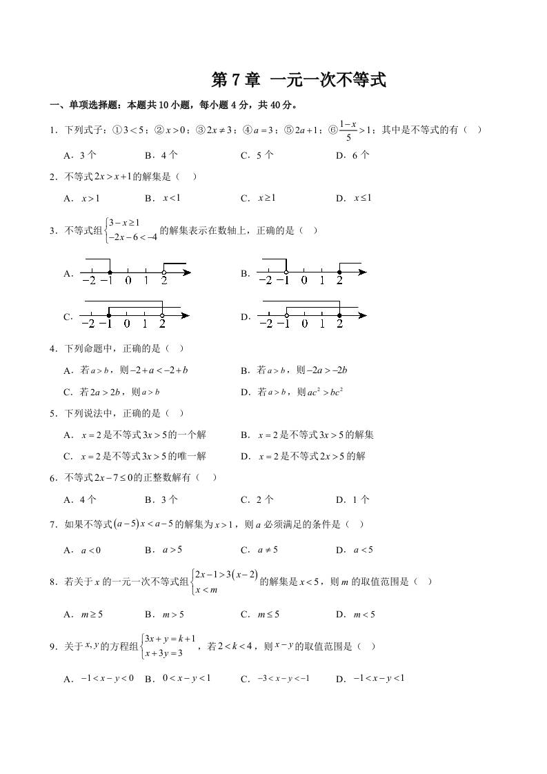 第7章 一元一次不等式(单元重点综合测试)(学生版)