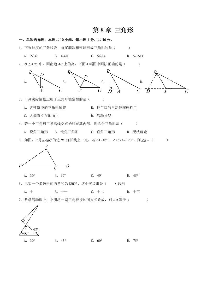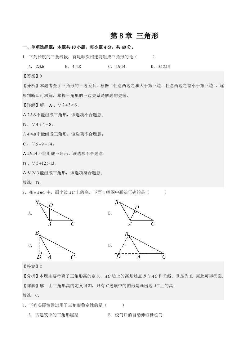 第8章 三角形 (单元重点综合测试)(学生版)
