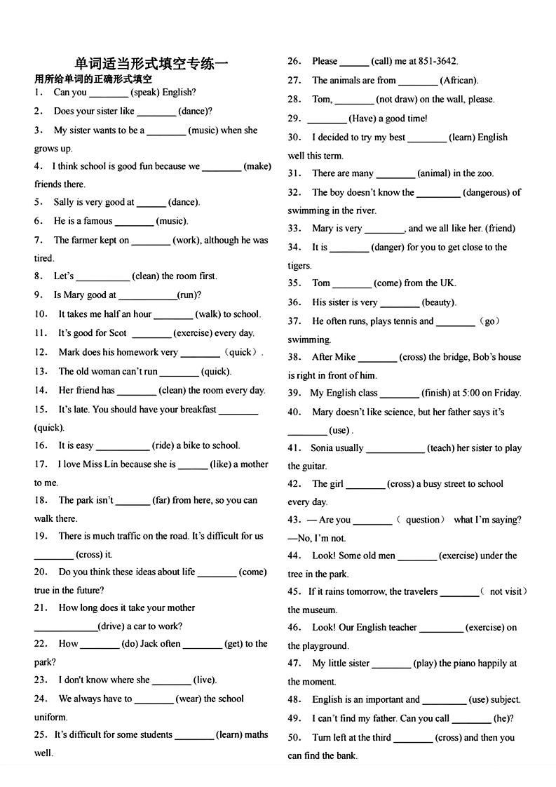 七上英语单词适当形式填空专练100道