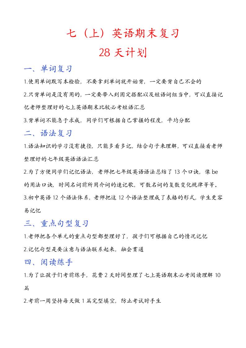 七上英语期末28天复习计划