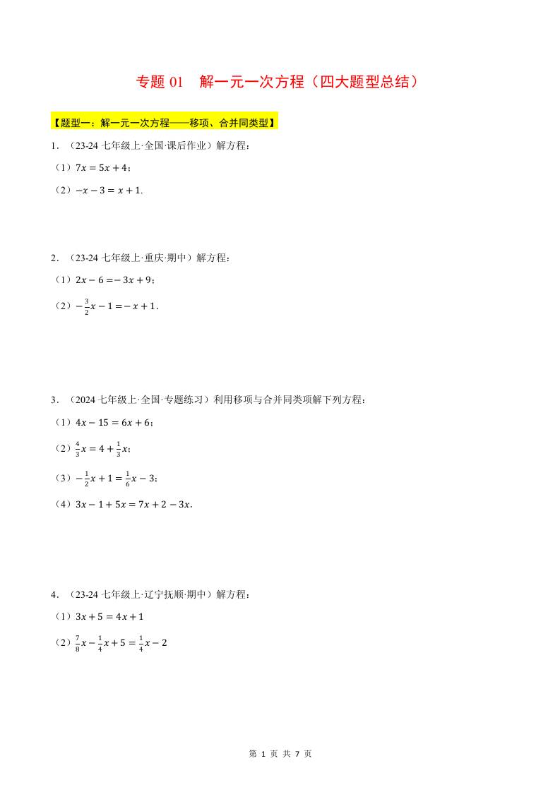专题01 解一元一次方程(四大题型总结)(计算题专训练)(华东师大版2024)(原卷版)
