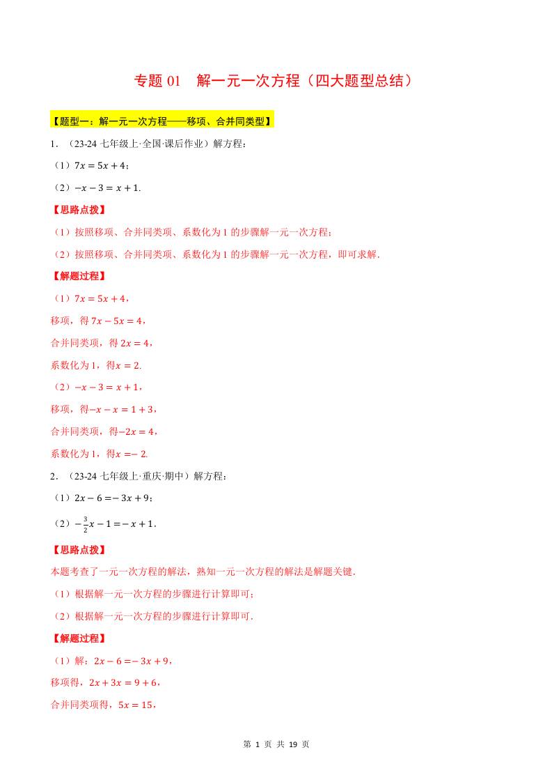 专题01 解一元一次方程(四大题型总结)(计算题专训练)(华东师大版2024)(解析版)
