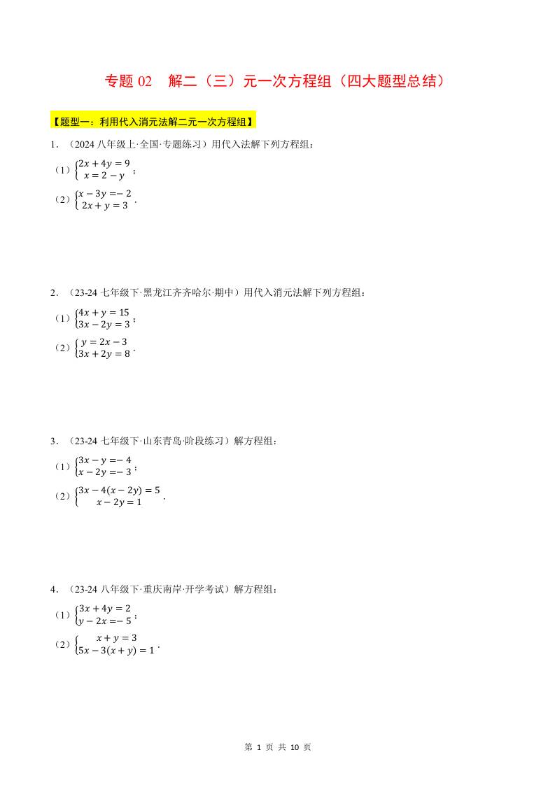 专题02 解二(三)元一次方程组(四大题型总结)(计算题专项训练)(华东师大版2024)(原卷版)