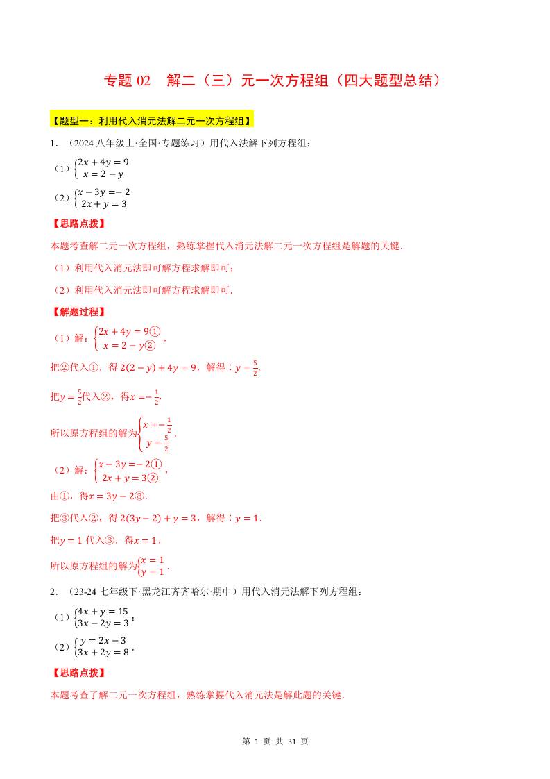 专题02 解二(三)元一次方程组(四大题型总结)(计算题专项训练)(华东师大版2024)(解析版)