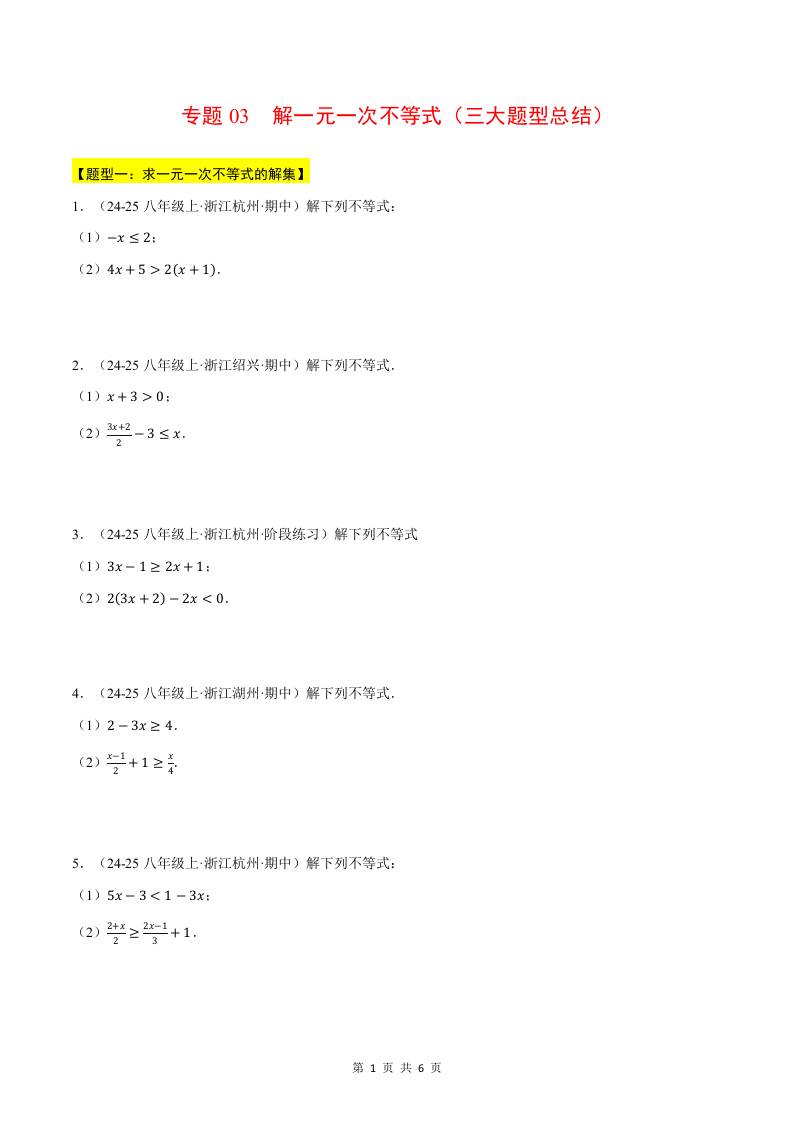 专题03 解一元一次不等式(三大题型总结)(计算题专项训练)(华东师大版2024)(原卷版)