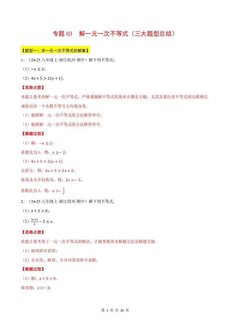 专题03 解一元一次不等式(三大题型总结)(计算题专项训练)(华东师大版2024)(解析版)