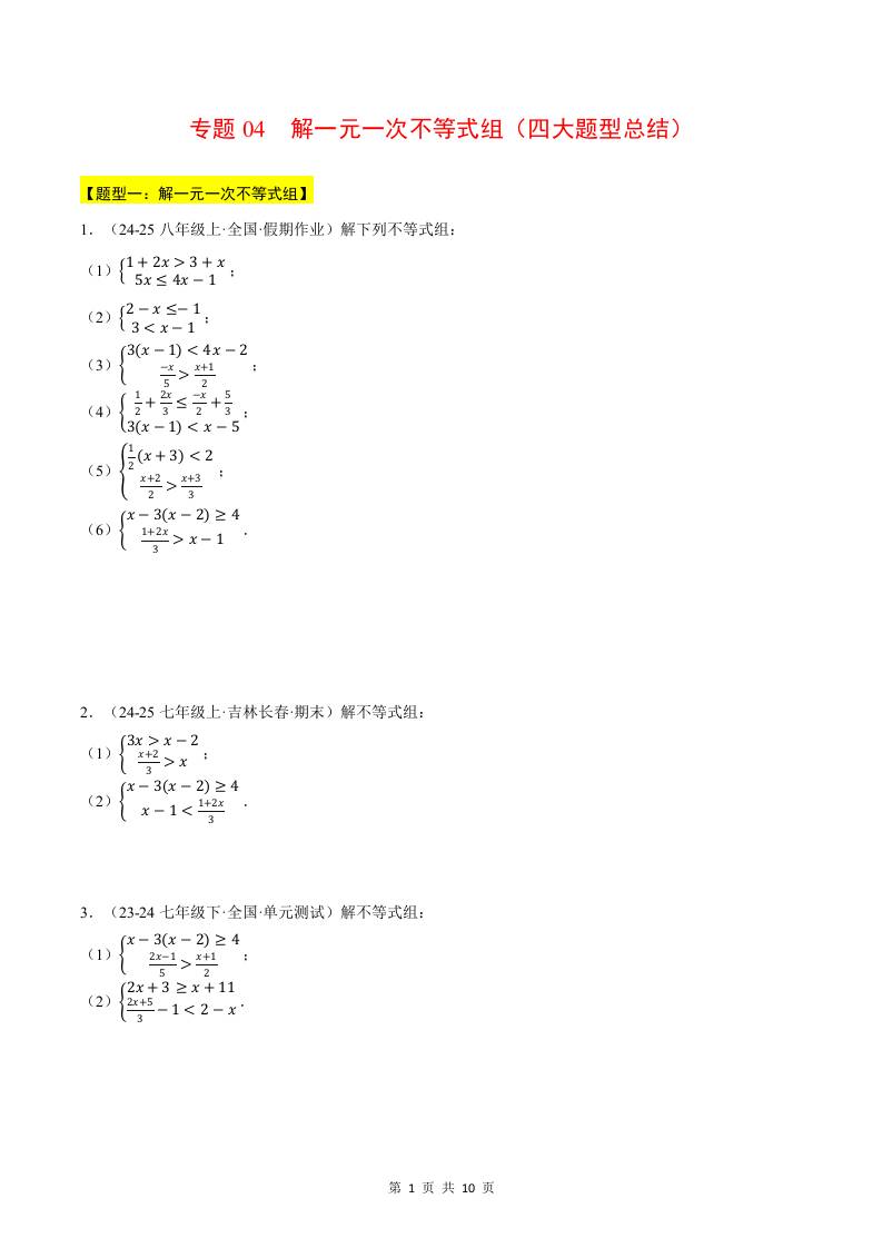 专题04 解一元一次不等式组(四大题型总结)(计算题专项训练)(华东师大版2024)(原卷版)