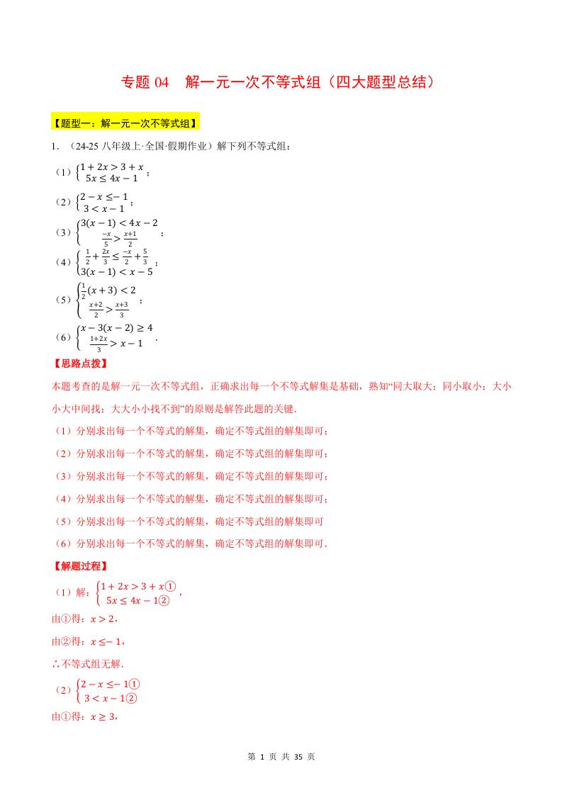 专题04 解一元一次不等式组(四大题型总结)(计算题专项训练)(华东师大版2024)(解析版)