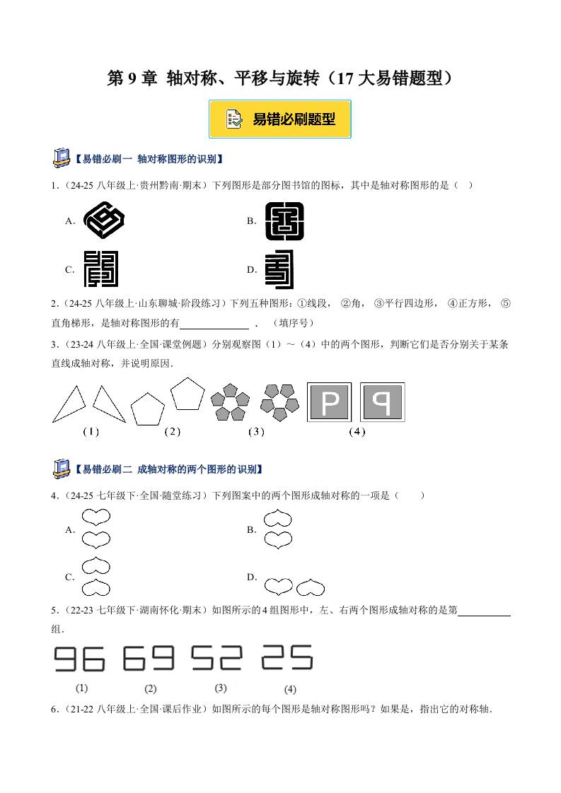 第9章 轴对称、平移与旋转(17大易错题型)(原卷版)