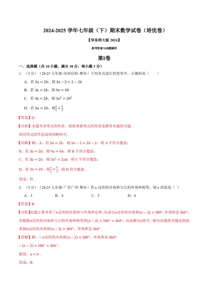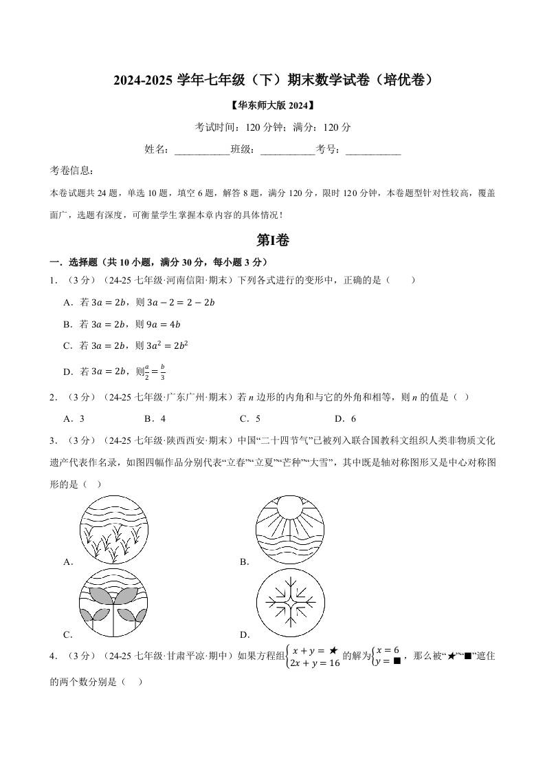 七年级(下)期末数学试卷(培优卷)(华东师大版2024)(教师版)