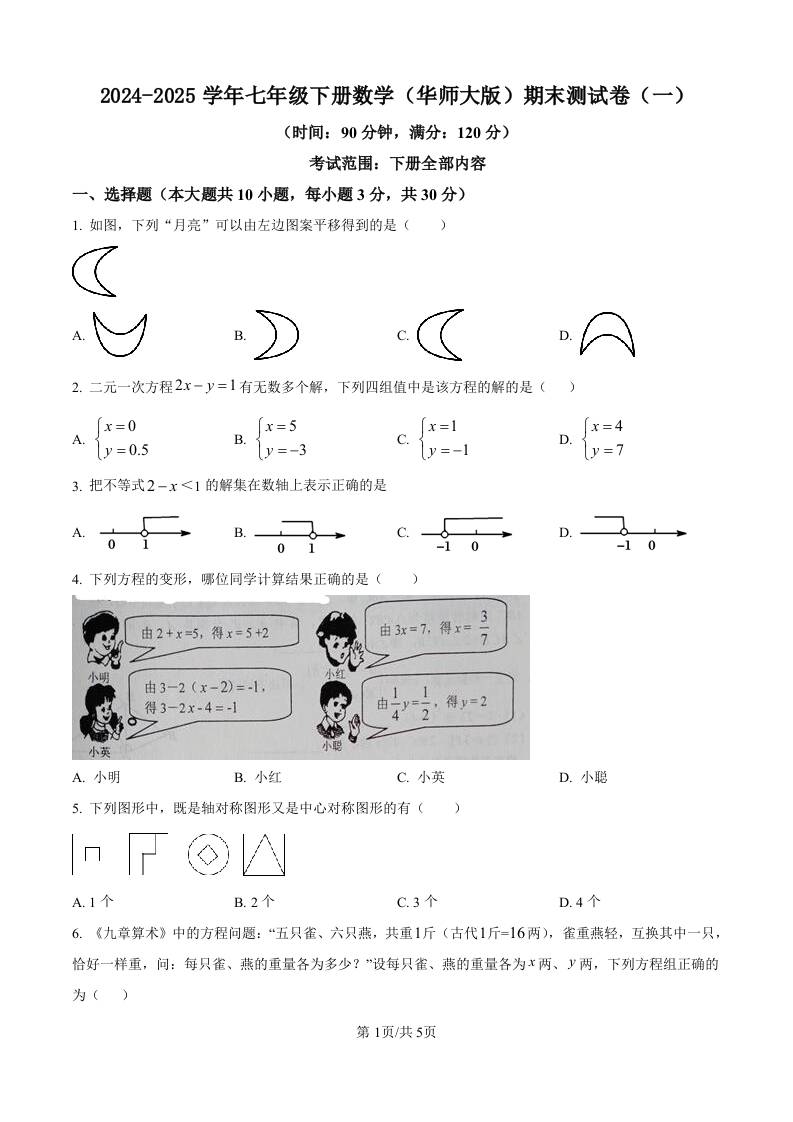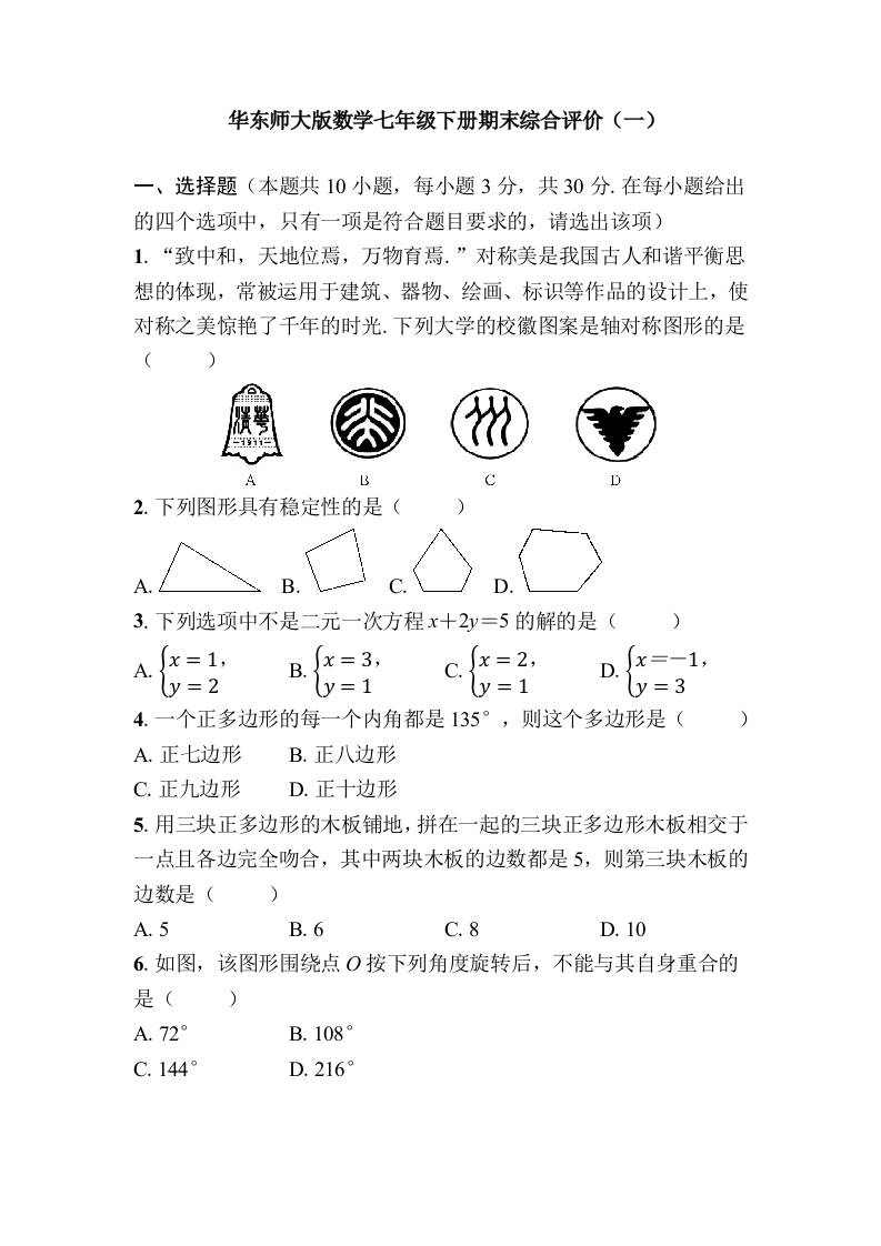 精品解析:期末测试卷(一)华东师大版七年级数学下册(原卷版)